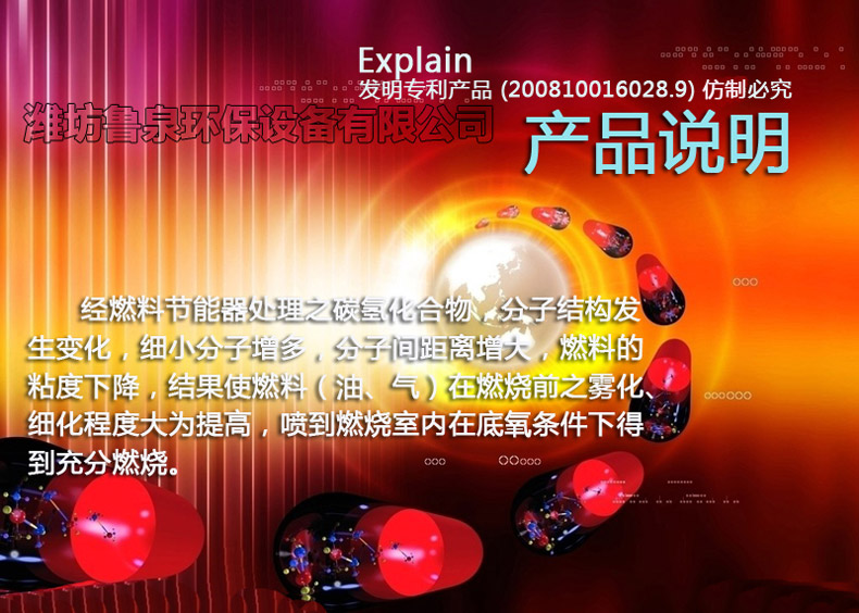 經(jīng)燃料節(jié)能器處理之碳?xì)浠衔铮肿咏Y(jié)構(gòu)發(fā)生變化,細(xì)小分子增多,分子間距離增大,燃料的粘度下降,結(jié)果使燃料(油、氣)在燃燒前之霧化、細(xì)化程度大為提 高,噴到燃燒室內(nèi)在底氧條件下得到充分燃燒,因而燃燒設(shè)備之鼓風(fēng)量可以減少百分之15至百分之20,避免煙道中帶走之熱量,煙道溫度下降百分之30左右。 節(jié)省了燃料,保護(hù)了廢氣對(duì)環(huán)境的污染。