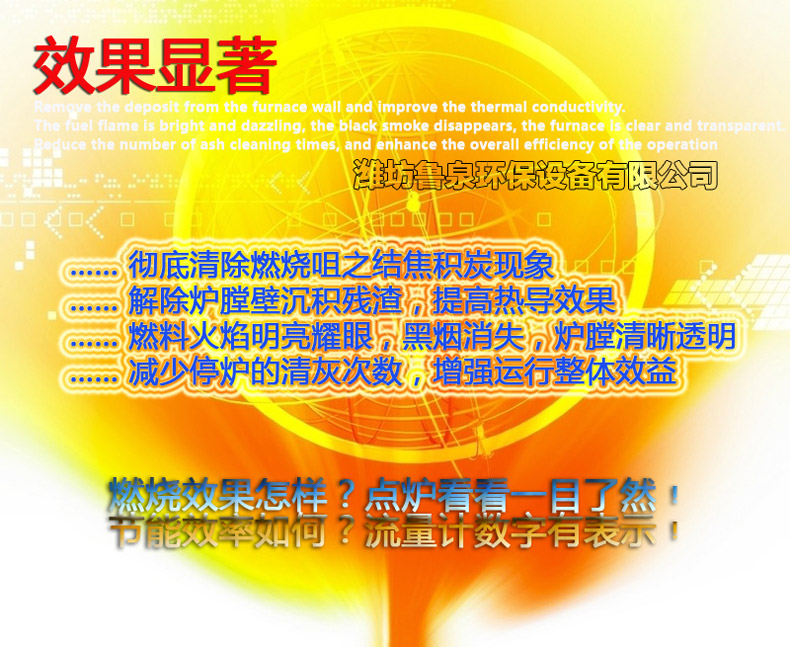 3. 解除因燃料得不到充分燃燒而爐膛壁積殘?jiān)F(xiàn)象,提高傳熱效果,改善熱導(dǎo)率。達(dá)到環(huán)保節(jié)能效果。